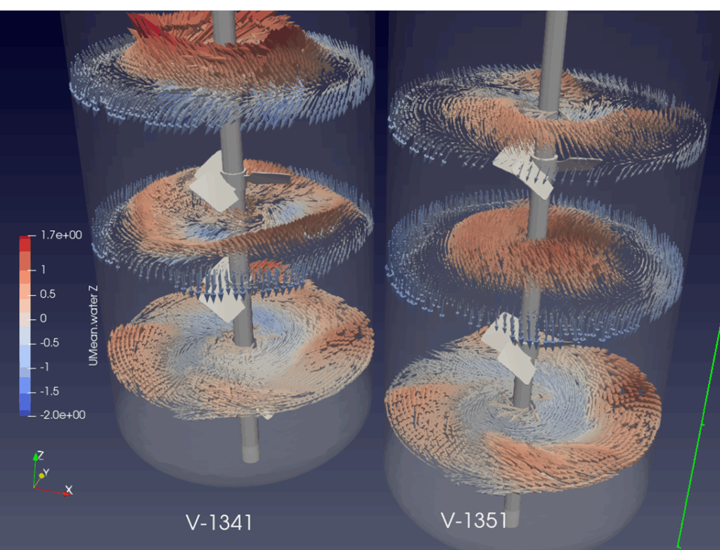 Estudo da capacidade de agitação e efeito geral no escoamento em bombas, agitadores ou ventiladores, prevenindo zonas cegas de mistura, ou formação de vórtices de superfície.